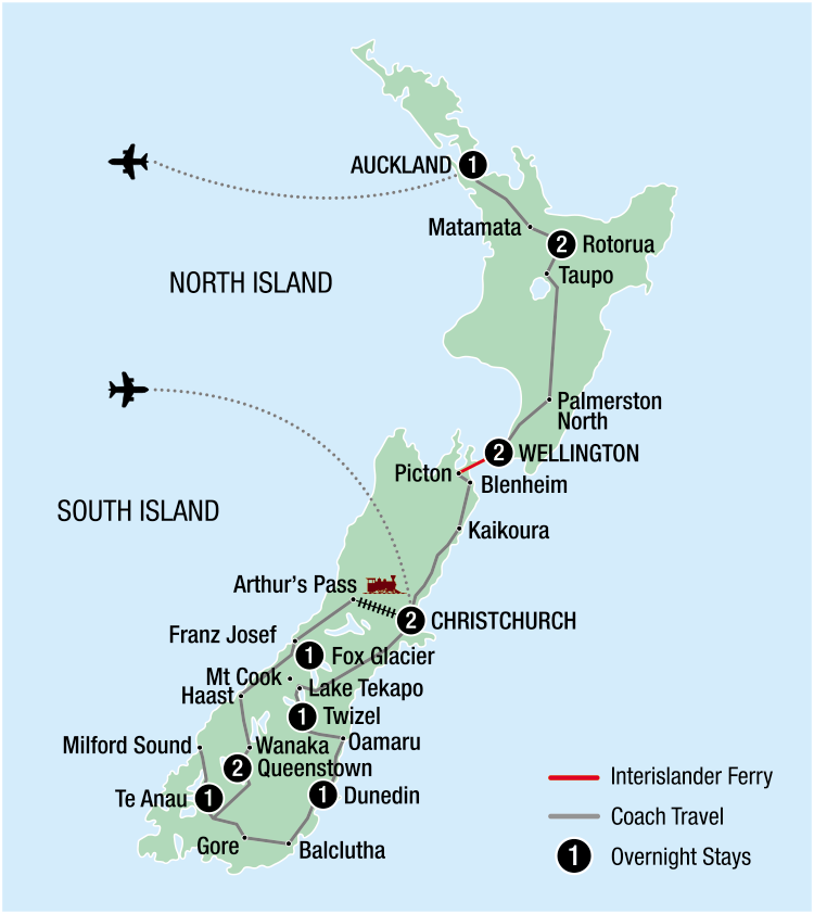 - 11 sumptuous dinners including complimentary pre-dinner drink at the Welcome Dinner and 3 specialty dinners: Walter Peak Homestead, Queenstown; Māori Hāngi and Concert, Rotorua; Farewell Dinner including pre-dinner drink, Auckland