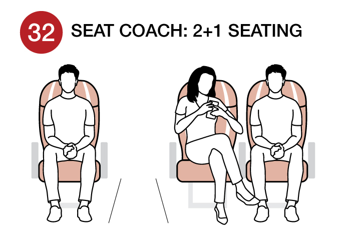 - COACH 32 seat Premium Economy; 2 door access; seat back tray table; cup holder; Restroom; daily onboard Wi-Fi allowance