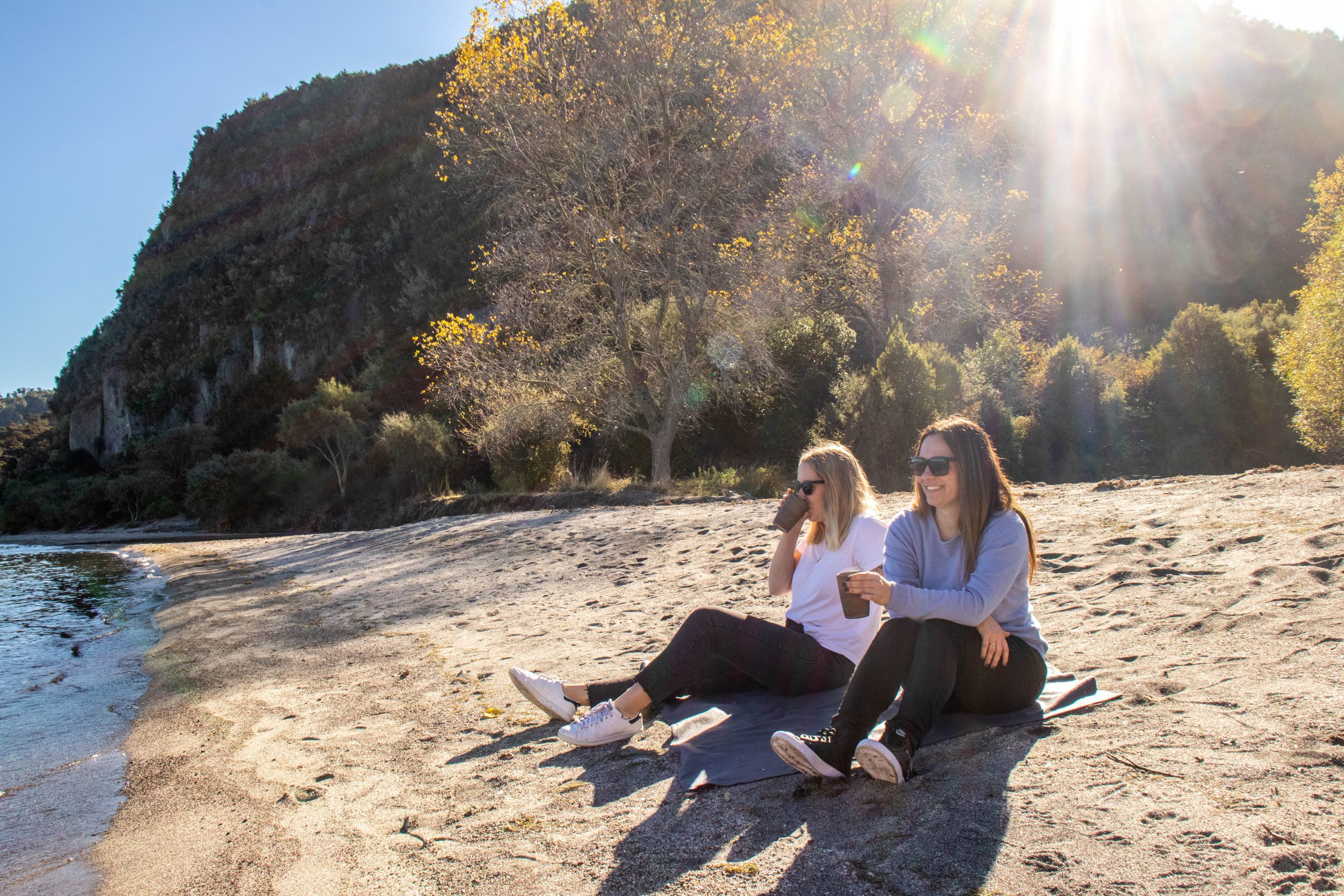 Waihora Beach is a special highlight, where you can stretch your legs, enjoy a complimentary refreshment, or take a seasonal dip. The rounded pumice stones and bright yellow lupins add a unique charm to this hidden spot. Often, you’ll have the entire bay to yourselves — the perfect way to unwind and connect with nature.
