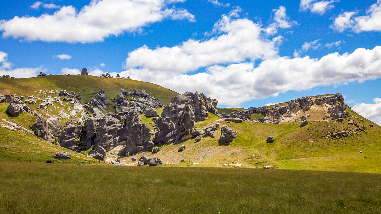 - Aerial views of Castle Hill and the route of the historic TranzAlpine railway.
