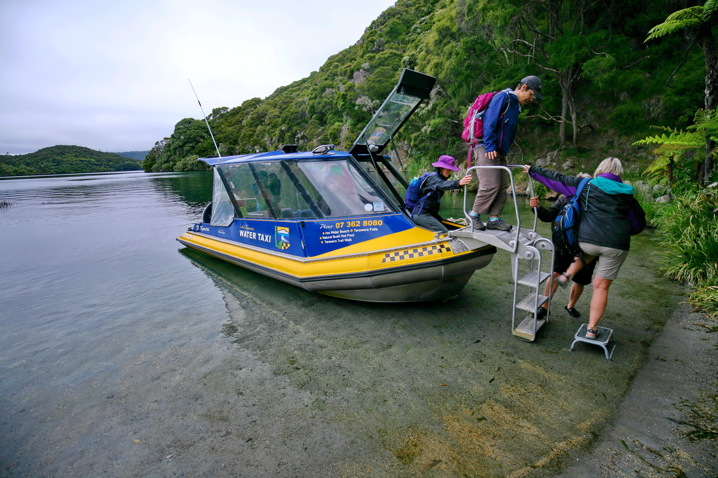 We meet at 7:00 AM at the Sky Tower in downtown Auckland before travelling south to Rotorua, famous for its steaming thermal vents, bubbling mud pools, and pristine lakes. Along the way, we stop at a local café—perfect for those needing a quick breakfast. Rich in Māori culture and volcanic history, Rotorua is shaped by the 1886 Mt Tarawera eruption, which buried a Māori village and left behind a landscape ideal for New Zealand nature hikes. From here, we continue to Lake Tarawera, where a noon water taxi takes us to the Lake Tarawera Trail’s midsection. This scenic hike winds along the lake’s shoreline, shaded by tree ferns and framed by ignimbrite cliffs, with opportunities to swim at pumice beaches and enjoy views of volcanoes and wilderness areas.